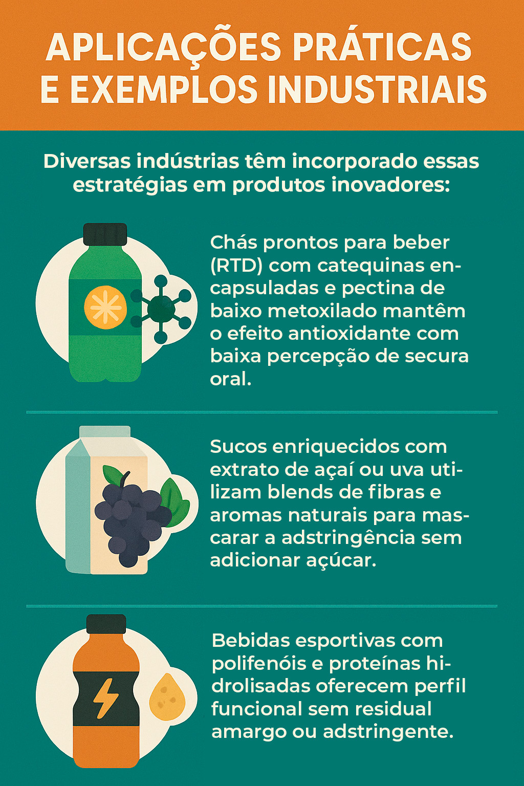 Estudos mostram que catequinas encapsuladas com goma arábica, maltodextrina ou proteínas lácteas reduzem significativamente a percepção de adstringência, ao mesmo tempo que mantêm a estabilidade antioxidante em bebidas prontas para consumo (RTD).