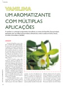 VANILINAUM AROMATIZANTECOM MÚLTIPLASAPLIC AÇÕESA vanilina é o principal componente da essência ou aroma de baunilha. Suas principais aplicações são na indústria de produtos alimentícios, onde é usada em bolos, doces, sorvetes, chocolates e bebidas.ORIGEMO aroma de baunilha, ou seja, a vani- lina, é obtida da planta Vanilla planifo- lia, uma espécie de orquídea de hábito escandente e crescimento reptante que existe do México ao Paraguai. A história desta orquídea começou a ser registra- da na Europa depois da descoberta da América, mas já fazia parte do dia a dia da civilização pré-colombiana. Na ver- dade, é uma das plantas usadas desde os tempos imemoriais pelas civilizações Maia e Azteca.O gênero Vanilla compreende dezenas de espécies; atualmente, são conhecidas mais de 50, sendo que as es- pécies mais usadas para fins comerciais são as americanas (Vanilla planifolia e Vanilla pompona) e a taitiana (Vanilla tahitensis). A Vanilla planifolia An- drews, também denominada de Vanilla fragrans, é a principal fonte natural de baunilha. A Vanilla pompona Schiede é considerada uma fonte de qualidade inferior. A Vanilla trigonocarpa é tam- bém considerada uma das melhores produtoras de baunilha.A Vanila fragrans Ames é uma trepadeira herbácea robusta, podendo atingir 10 a 15 metros de altura, em cima de suporte. Seu caule é cilíndrico,carnudo, com 10 a 15 milímetros de diâmetro, e composto de elementos de 12 a 15 centímetros de comprimento, soldado um ao outro por um tipo de nó. As folhas, em formato de ponta de lança, com pedúnculo muito curto, são espessas, planas, carnudas e de um verdebrilhante. Medem de 10 a 15 centíme- tros de comprimento e 4 a 8 centímetros de largura. As flores são grandes, aromá- ticas, com aspecto ceroso, de cor ama- relo esverdeado, com pétalas e sépalas de 5 a 7 centímetros de comprimento. Florescem somente cerca de oito horas38ADITIVOS & INGREDIENTES