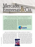 DSM ADQUIRE ALAND PARA FORTALECER SUA POSIÇÃO EMVITAMINA C NO MERCADOA DSM, empresa global de ciências da vida e ciências de materiais, chegou a um acordo para adquirir a Aland Holding Limited, produtora de vitamina C, com sede em Hong Kong, na China.A aquisição da Aland permitirá a DSM fortalecer ainda mais sua posição em vitamina C, aumentando sua presença global em vitaminas para nutrição humana e saúde, nutrição animal, saúde e cuidados pessoais.A DSM continua plenamente empenhada na fabricação de vitamina C em sua atual instalação em Dalry (Escó- cia, Reino Unido).A aquisição atende integralmente os requisitos financeiros e estratégicos da DSM.A Aland foi fundada em 1990, e tem uma unidade de produção em Jingjiang, província de Jiangsu, na China. Em 2013, a empresa realizou vendas líquidas de cerca de US $ 90 milhões em vitamina C.A DSM planeja investir em instalações de produção da Aland pela excelência operacional, incluindo a qualidade e desempenho ambiental.A transação, queexclui as atividades de saúde da Aland, está sujeita às condições habituais e deverá ser concluída nos próximos seis a nove meses.A vitamina C, maior do mundo em termos de volume, é um ingrediente essencial de saúde que o organismo não pode produzir e que precisa ser absorvida através da alimentação ou suplementação.A vitamina C é amplamente encontrada em frutas e legumes. Os subsídios alimentares recomendados de vitamina C nos Estados Unidos foram recentemente revistos para 90mg/ dia para homens e 75mg/dia para mulheres.ARCOR MODERNIZA AS EMBALAGENS DE 7BELOA Arcor do Brasil, uma das maiores fabricantes de alimentos e a maior exportadora de guloseimas do Brasil, rejuvenesce a tra- dicional marca de balas mastigáveis e pirulitos 7Belo, lembrada no mercado pelo famoso ícone de cartas. A marca cresceu 22% em valorem2014,contra18%noanoanterior.Amudançatemcomo objetivo gerar atratividade para o público infantil, além de tornar o produto ainda mais atraente no ponto de venda. Com a tipografia em branco, a criação buscou ter um color brand maisconsistente entre os produtos da linha, destacandoa marca e a deixando mais clean. A cor de fundodas embalagens é o azul marinho, tom já associadopelo consumidor. Além da modernização das emba-lagens, a marca também inova na formulação e lançao sabor Yogurte. Com gramaturas de 150g e 700g, anovidade é a substituição dos corantes artificiais pornaturais, os quais são responsáveis por conferir ou intensificar a cor dos alimentos, melhorando a aparência e aceitação do pro- duto.A linha regular de balas mastigáveis 7Belo é composta pelos sabores Framboesa e Yogurte. Já a linha Gelatin é oferecida nas versões Amoras, Cobritas Ácidas, Dentaduras e Minhocas Ácidas. A apresentação em pirulito está disponível no sabor Framboesa.Há 33 anos, a multinacional argentina Arcor atua em todo o terri- tório brasileiro, sendo o terceiro produtor de chocolates do país, líder no segmento de chicles infantis e um dos principaisplayersdebiscoitosdoBrasil.Élídermundialnaprodução de balas e principal exportadora de guloseimas do país,produzindo 170 mil toneladas/ano.O GrupoArcor é uma empresa global, de origem Argentina, exportadora de guloseimas do Brasil, Argentina e Chile e uma das maiores fabricantes de chocolates da América Latina.8Mercado, Empresas&Cia.ADITIVOS & INGREDIENTES