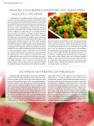 MERCADO, EMPRESAS & CIASALADAS COLORIDAS E SAUDÁVEIS SÃO IDEAIS PARA AGUÇAR O PALADARA salada pode ser uma refeição completa, desde que sejam incluí- das fontes de todos os grupos alimentares: carboidratos, proteínas, gorduras, vitaminas, minerais e fibras.Além de auxiliar na dieta, saladas são grandes aliadas na prevenção de doenças, como osteoporose e doenças do coração. Incluir salada nas refeições diárias é essencial para manter a boa saúde. Além disso, ela é uma ótima aliada para quem busca perder peso de forma saudável. Compostas por frutas, verduras e legumes, as saladas são ricas em nutrientes, vitaminas, fibras e minerais que auxiliam na proteção da saúde e ajudam na prevenção de doenças como diabetes e que envolvem o coração. Uma salada que contém ingredientes de todos os grupos alimentares pode até mesmo substituir uma refeição. Molhos diferenciados, carnes brancas, peixes, castanhas e frutas são uma ótima opção e garantem versatilidade do prato. O cardápio variado é muito importante, pois é uma forma de agradar a todos os paladares. Muitas pessoas buscam comidas leves na hora de jantar e nos dias mais quentes, e desde que os alimentos certos sejam escolhidos para compor a salada, ela pode se tornar uma refeição completa. O ideal é que seja uma refeição bem colorida: alimentos brancos são alimentos que possuem alicina, uma substância que auxilia na redução do colesterol, como o alho e a cebola; alimentos roxos são ricos em ácido elágico, que evita o envelhecimento precoce e diminui os riscos de células cancerígenas, pois contêm substâncias como o reveratrol e as antocianinas, que podem prevenir o câncer. O repolho roxo, uva, beterraba e berinjela são exemplos de alguns desses alimentos. Já os alimentos vermelhospossuem antoacina, um flavonoide com ação imunoestimulante que ajuda no sistema circulatório, e licopeno, um antioxidante que auxilia na prevenção da osteoporose, como o tomate, pimentão, morango e maçã; alimentos verdes são ricos em ácido fólico, que é essencial para o bom funcionamento do sistema nervoso central, também muito importante para as gestantes, pois auxiliam na boa formação do tubo neural do bebê. Possuem luteína, betacaroteno, ferro, cál- cio, fósforo e clorofila, pigmento responsável pela coloração, como alface, rúcula, ervilha, espinafre, entre outros. Alimentos amarelos auxiliam no bom funcionamento do sistema imunológico, da visão e do coração. São também ótimos para a pele e a mucosa. São ricos em betacaroteno e vitamina C. Um exemplo de alimentos amarelos são mangas, batatas e mandioquinha.OS VÁRIOS NUTRIENTES DA MELANCIAO agradável saber adocicado, baixas calorias, alto nível de fibras e muitos nutrientes; estamos falando da melancia. Além destes be- nefícios, um estudo recente concluiu que a melancia pode ser eficaz contra a pré-hipertensão, um precursor das doenças cardiovasculares. A pesquisa, a primeira desse tipo realizada em humanos, foi feita por cientistas da Universidade do Estado da Flórida, nos Estados Uni- dos. Os pesquisadores descobriram que a ingestão diária de 6g do aminoácido L-citrulina/L-arginina, retirados do extrato da melancia, durante seis semanas, resultou em uma melhoria da função arterial. Essa descoberta sugere que este alimento funcional tem um efeito vasodilatador, que pode impedir que a pré-hipertensão progrida para a hipertensão total, um importante fator de risco para ataques cardíacos e derrames. O efeito imediato foi uma redução da pressão arterial aórtica em todos os nove participantes pré-hipertensivos,sendo quatro homens e cinco mulheres na pós-menopausa, com idades entre 51 e 57 anos. A melancia é a mais rica fonte natural comestível de L-citrulina, a qual está intimamente relacionada com a L-arginina, um aminoácido necessário para a formação do óxido nítri- co essencial para a regulação do tônus vascular e para a manutenção de uma pressão arterial saudável. Uma vez no corpo, a L-citrulina é convertida em L-arginina. Simplesmente consumir a L-arginina como suplemento dietético não é uma opção para muitos adultos hiper- tensos porque pode causar náuseas, desconforto gastrointestinal e diarreia. Por outro lado, a melancia é bem tolerada por praticamente todos os pacientes. Os participantes no estudo-piloto não relataram nenhum efeito adverso. E, além dos benefícios vasculares da citrulina, a melancia é uma fonte abundante de vitamina A, B6, C, potássio, fibras e licopeno, um antioxidante poderoso.10ADITIVOS & INGREDIENTES