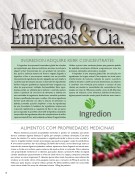 ALIMENTOS COM PROPRIEDADES MEDICINAISMuitos alimentos possuem propriedades medicinais e podem ser utilizados para aliviar dores e combater algumas doenças. O agrião, por exemplo, combate a bronquite. Com altos teores de vitamina C e outros compostos, o vegetal pode ajudar a aliviar a tosse e reduzir o catarro. O agrião também contém isotiocianato, que ajuda a propagar a ação dos antibióticos. A erva-cidreira acalma a dor de estômago. Da família da hortelã, a erva-cidreira age sobre os músculos do sistema digestivo, ajudando a acalmar espasmos e dores. Segundo um estudo ame- ricano, o chá de erva-cidreira, quatro vezes ao dia, ajuda a aliviar o incômodo. Outro alimento com propriedades medicinais é o rabanete, que ajuda a baixar a pressão. As folhas do vegetal contêm substâncias que aumentam os níveis de óxido nítrico no sangue, composto conhecido por relaxar os vasos sanguíneos. O rabanete possui altos níveis de potássio, cujos efeitos são similares ao do óxido nítrico. Uma pesquisa revelou que o consumo de 90mg de extrato de folhas por quilo de peso corporal reduz a pressão.As folhas também podem ser consumidas cruas, como salada. Um maço de rabanetes fornece 135mg de potássio.10Mercado, Empresas&Cia.INGREDION ADQUIRE KERR CONCENTRATESA Ingredion Incorporated, fornecedora global de soluções em ingredientes para diversas indústrias, anunciou acordo para adquirir a Kerr Concentrates, Inc., um produtor de concentra- dos, purês e essências naturais de frutas e vegetais. Segundo a Ingredion, a Kerr é uma empresa rentável, com um portfólio interessante de ingredientes de valor agregado que vem ampliar a sua linha atual de soluções naturais e clean label. Os ingredientes da Kerr realçam a qualidade e a riqueza de frutas e vegetais crus, além de proporcionar múltiplas funcionalidades. Estes ingre- dientes podem ser utilizados para melhorar a nutrição, textura, sabor e aparência de uma série de alimentos e bebidas em uma variedade de segmentos, desde sucos, smoothies, produtos lácteos e panificação até sopas e molhos. Um único ingrediente da Kerr pode adicionar cor, sabor e textura em alimentos ou bebidas, tornando possível simplificar a lista de ingredientes de uma formulação. A tendência de ingredientes simples está crescendo rapidamente e a aquisição da Kerr é mais um passo para a expansão do portfólio clean label da Ingredion, ampliando seu portfólio de ingredientes, além das soluções à base de milho, tapioca e batata.A Kerr está localizada em Salem, Oregon, EstadosUnidos, e possui duas modernas plantas que garantem padrão de qualidade consistente, eficiência e segurança por meio dos processos otimizados, automação e inovação.A Ingredion é uma empresa global, líder em soluções em ingredientes de origem natural. Com expertise em áreas como transformação de texturas, redução de açúcar e gordura, melhoria de sabor e perfil nutricional de alimentos, seu objetivo é contribuir com inovações para acelerar o sucesso de seus clientes em atender as necessidades dos consumidores. Com atuação em mais de 100 países, atende a mais de 60 diferentes setores da indústria, como alimentos, bebidas, farmacêutico, higiene pessoal, nutrição animal, papel & celulose, entre outros.