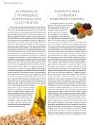 MERCADO, EMPRESAS & CIAAS DIFERENÇASE PROPRIEDADES NUTRICIONAIS DOS ÓLEOS VEGETAISSão vários tipos e sabores e alguns prometem uma série de bene- fícios à saúde. Os óleos vegetais são essenciais para a dieta, por isso não devem ser eliminados da alimentação. Isso porque fornecem ácidos graxos importantes e são imprescindíveis para a absorção das vitaminas lipossolúveis (A, D, E, K). Entretanto, esse nutriente é também o mais calórico da pirâmide alimentar, por isso seu consumo deve ser mode- rado. O que diferencia um óleo vegetal de outro é o tipo de cadeia de gorduras, que pode ser insaturada (gordura benéfica ao organismo) ou saturada (deve ser consumida em menores quantidades). Outro ponto que deve ser analisado é a sua termorresistência, ou seja, a temperatura máxima que o óleo pode alcançar sem alterar suas propriedades. Isso porque todos eles, quando aquecidos a altas temperaturas, reduzem seus benefícios nutricionais. Em uma alimentação balanceada, as gor- duras devem representar de 25% a 30% do consumo calórico diário. Além de estar presente nos óleos, a gordura pode ser encontrada nos alimentos de origem animal, fazer parte de quase todos os alimentos processados e industrializados e, inclusive, em algumas frutas, como o abacate. Entre os óleos vegetais mais populares está o óleo de soja, um dos mais consumidos devido ao seu sabor, que é mais suave quando comparado aos outros óleos. Seu percentual de gordura saturada é de 15%, ou seja, possui 85% de gordura insaturada, que traz uma série de benefícios ao organismo. Outro óleo vegetal bastante popular é o óleo de milho, que contém uma boa quantidade de ácido linoleico, conhecido pelo seu potencial anti-inflamatório. Com um porcentual de gordura saturada de 13%, ele pode ser uma boa alternativa ao popular óleo de soja. Já o óleo de girassol tem apenas 10% de gordura saturada e é muito termorresistente, podendo chegar a 200C° sem perder ou alterar suas propriedades nutricionais. O óleo de canola, no quesito sabor, se parece muito com o óleo de soja. Nutricionalmente, é o que possui menor teor de gordura saturada, em torno de 6%. Por isso, quando consumido in natura, ou seja, sem aquecê-lo, é o mais saudável entre os óleos populares. Sua termorresistênciachega a 150C°. O azeite também é bastantepopular. Sua composição é bem diferente dosoutros óleos vegetais. Embora também tenhavárias propriedades nutricionais, durante o seuprocesso de produção passa por um aqueci-mento, reduzindo seus benefícios. Com 15%de gordura saturada, sua termorresistênciaé de 180C°. E o óleo de dendê, com 50%de gordura saturada, é o que deve serconsumido com mais parcimônia devidoà baixa propriedade nutricional.ALIMENTOS PARA COMBATER A HIPERTENSÃO ARTERIALA hipertensão arterial é uma doença silenciosa. Na maioria dos casos, não apresenta sintomas. De acordo com a Sociedade Brasileira de Hipertensão,no Brasil 17 milhões de pessoas so-frem de pressão alta e a estimativa éde que até 2025 o número de hiper-tensos em países em desenvolvimentocresça 80%. Entre os principais fatores de riscoestão má alimentação, sedentarismo, tabagismoe consumo excessivo de bebidas alcoólicas. O controle da pressão arterial é um dos passos fundamentais para a prevenção de doenças do coração e acidentes vasculares (derrames).A alimentação deve ser composta por cereais integrais, leguminosas, hortaliças, frutas e óleos vegetais. Devem ser evitados alimentos refinados, salgadinhos, produtos congelados, embutidos, refrigerantes e bebidas alcoólicas. Outro alerta é quanto ao consumo de sódio; seu excesso favorece a retenção de líquidos no organismo, aumentando a pressão arterial. Para quem deseja controlar a hipertensão arterial uma boa dica é o consumo de leguminosas. Comer uma xícara de feijão, ervilha, grão- de-bico, lentilha e outras leguminosas diariamente, pode reduzir o risco de doença cardíaca e melhorar o controle da pressão arterial. Estes alimentos são boas fontes de potássio, que ajudam a regular a quantidade de água dentro das células, melhorando o controle da pressão arterial. O gergelim é outra opção saudável. O óleo de gergelim auxilia na redução do colesterol total e do colesterol LDL, pois é fonte de ácidos graxos insaturados. O gergelim também é fonte de vitamina E, antioxidante que protege as células da ação dos radicais livres, reduz o risco de aterosclerose e evita a oxidação do LDL, prevenindo infartos. Saboroso, pode ser usado em saladas, pratos frios e massas. Outras opções para controlar a hipertensão arterial incluem o cacau, cujos flavonóides presentes ajudam os vasos sanguíneos a funcionarem melhor, o que reduz a pressão sobre o coração, além de ser fonte de catequina e epicatequina, que auxiliam na redução da agregação plaquetária e no controle dos níveis de colesterol; a cranberry, fruta rica em flavonóides, que apresentam propriedades antioxidantes, sendo que o suco de cranberry na dieta reduz a oxidação do LDL e promove aumento dos níveis de HDL; o suco de uva integral, fonte de resveratrol e antocianinas, poderosos antioxidantes que neutralizam os radicais livres e relaxam os vasos, o consumo do suco ajuda no controle da pressão arterial, prevenindo doenças cardiovasculares; a romã, cujo consumo diário do suco da fruta auxilia na redução das taxas de LDL, a fração do colesterol associada ao entupimento dos vasos; as semente de chia, fonte de ômega 3, vasodilatador suave que auxilia no controle da agregação plaquetária, além de atuar na prevenção e controle de doenças cardiovasculares, aterosclerose e hipertensão arterial; e as cápsulas de óleo de peixe (ômega 3), que auxiliam na prevenção e controle de doenças cardiovasculares, aterosclerose e hipertensão arterial.12ADITIVOS & INGREDIENTES
