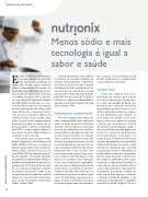 EMPRESA EM DESTAQUEMenos sódio e mais tecnologia é igual a sabor e saúdeEstudos e análises comprovam que o consumo excessivo de sal e sódio pode desencadear problemas de saúde como doenças renais, cardiovas- culares e hipertensão. No mundo, são registradas oito milhões de mortes por ano causadas por hipertensão, sendo que 1,65 milhão é devido ao sódio. A boa notí- cia é que dados da Organização Mundial da Saúde (OMS) revelam que, se o con- sumo de sal fosse inferior a cinco gramas por dia (ou dois gramas de sódio por dia, já que 40% do sal é composto de sódio), seria possível economizar bilhões em cuidados médicos. Nesse sentido, quase todos os países estão implementando programas nacionais de redução de só- dio para atingir os níveis recomendados pela OMS e assim também reduzir os seus gastos da saúde pública ligados ao consumo excessivo de sódio.Neste quadro geral, pesquisa realiza- da pela Organização Pan-Americana da Saúde (OPAS) revelou que o consumo de alimentos processados, como comida con- gelada, molhos e massas, cresceu 26,7% entre 2000 e 2013 na América Latina. No Brasil, segundo a Associação Brasileira das Indústrias da Alimentação (ABIA), os produtos industrializados no país são res- ponsáveis por 23,8% do consumo de sódio. E com o aumento contínuo do consumo de alimentos processados, estima-se que essa participação deve aumentar e poderia chegar até à casa dos 60% nos próximos anos, mesmo nível de países como Estados Unidos e Reino Unido.Ciente da importância e da tendência de evolução do consumo brasileiro de produtos industrializados, o Ministério da Saúde desenvolveu o Plano Nacional da Redução do Sódio em Alimentos Pro- cessados, que tem como objetivo atingir o patamar de consumo de sódio indicado pela OMS. Para isso, entre 2017 e 2020 as reduções nos alimentos industrializados que mais contribuem a ingestão de sódio devem chegar a 50%.DEMANDA DO CONSUMIDORAlém das obrigações de reduções de sódio compromissadas pelas indústrias dentro do plano nacional do Ministério da Saúde, existe também uma demanda crescente do consumidor por produtos mais saudáveis e reduzidos em sódio. Um estudo recente feito junto aos consumi- dores brasileiros demonstrou que 20% (terceiro lugar depois de preço e teor de cerais integrais) das pessoas que leem ró- tulos de produtos alimentícios procuram informação sobre o teor de sódio. Uma porcentagem muito maior do que a pro- cura e interesse por informações sobre açúcares ou gorduras. Para responder a esta nova exigência do consumidor, cada vez mais as indústrias alimentícias desenvolvem novas linhas de produtos reduzidos em sódio. Sem contar que em um momento de crise econômica, como a que o Brasil enfrenta, um projeto de re- dução de sódio no portfólio de produtos já existentes requer menos investimentosque a criação e desenvolvimento de um produto totalmente novo e ainda satisfaz a necessidade do consumidor.TECNOLOGIAA Nutrionix, empresa francesa es- pecializada em soluções para redução de sódio na alimentação, decidiu inves- tir e abrir uma unidade no Brasil, pois identificou que o mercado nacional de ingredientes precisaria oferecer às in- dústrias alimentícias produtos e soluções de alta performance para alcançar as novas metas. Isso porque os sais tecno- lógicos devem ser capazes de garantir a manutenção da aparência e textura dos alimentos industrializados, já que o sal é responsável por regular parâmetros técnicos nos processos de fabricação, como fermentação, conservação e re- tenção de água. O objetivo da Nutrionix é atender principalmente à necessidade da indústria alimentícia de reduzir o sódio sem alterar o paladar, já que é um item essencial para manter a identidade do produto final e o sabor que o consumidor aprecia. Logo, substituir o sal das recei- tas e manter a qualidade e sabor requer tecnologia e experiência baseadas no conhecimento das propriedades físicas e dos comportamentos organolépticos dos minerais. Dessa forma, a redução de sódio requer uma operação complexa e delicada na linha de produção a fim de preservar integralmente o equilíbrio sensorial do produto original. Por isso,24ADITIVOS & INGREDIENTES
